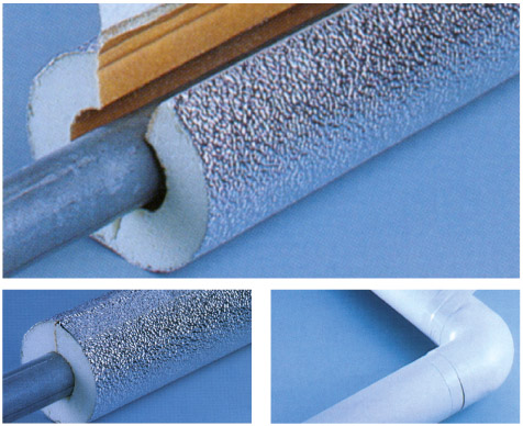 Tubo isolante in poliuretano espanso con superficie esterna rivestita con foglio in PVC o alluminio a chiusura autoadesiva.