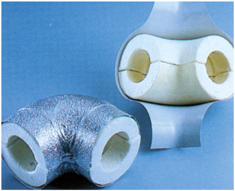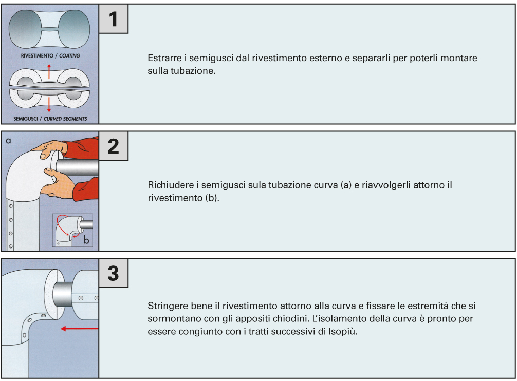 Per completare e perfezionare l’isolamento è possibile applicare dei semigusci in poliuretano rivestito con l’apposito involucro in PVC o alluminio e quindi fasciare con il relativo nastro autoadesivo la curva stessa e i tratti rettilinei adiacenti.