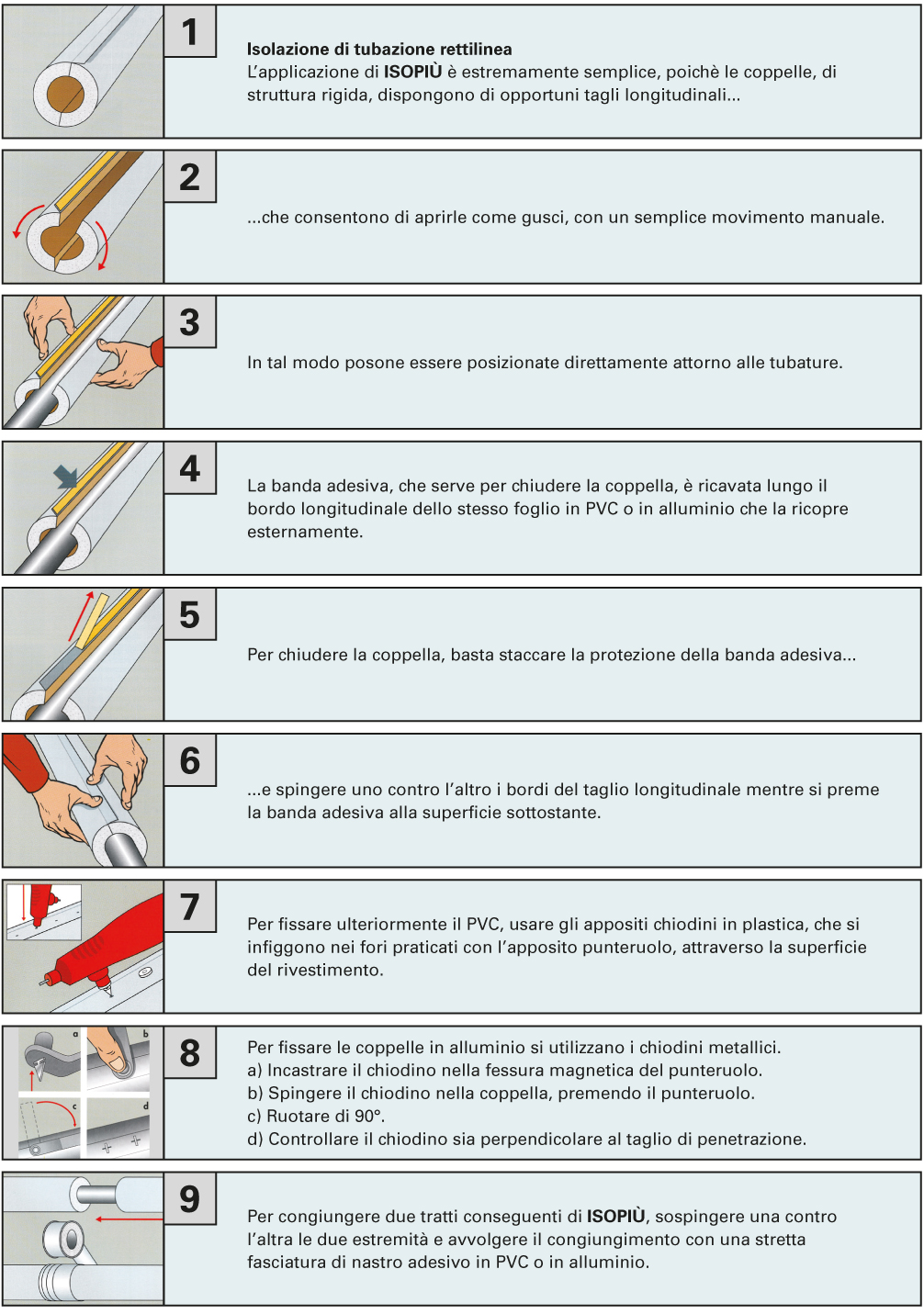 ISOPIÙ si installa in modo semplice: basta aprire la coppella esercitando una lieve pressione verso l’esterno, applicarla sulla tubazione e poi richiuderla sigillandola con il bordo autoadesivo.
