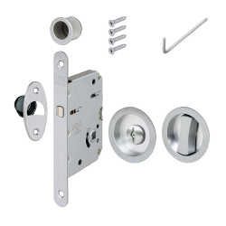 È disponibile sia per porte scorrevoli ad anta unica sia ad anta doppia, in due modelli: Rotonda e Quadra, nella versione con serratura, senza serratura, con serratura con chiave pieghevole e con foro a cilindro europeo.
