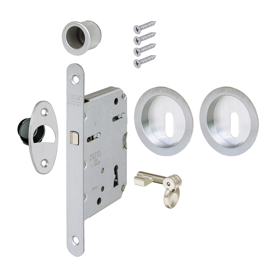 È disponibile sia per porte scorrevoli ad anta unica sia ad anta doppia, in due modelli: Rotonda e Quadra, nella versione con serratura, senza serratura, con serratura con chiave pieghevole e con foro a cilindro europeo.