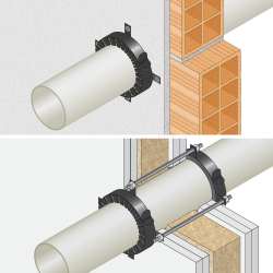 GLOBAL BUILDING GB-C sono collari per la sigillatura esterna di attraversamenti di tubazioni in PVC, PE, PP e fasci di cavi elettrici costituiti da guscio metallico, in modo da poter essere facilmente posizionati intorno al tubo/fascio da proteggere.