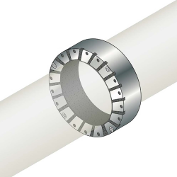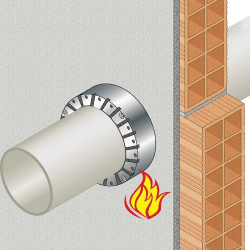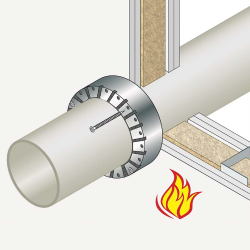 Collare per tubazioni senza alette di fissaggio, garantendo pertanto minimi ingombri, protegge l'attraversamento di tubazioni combustibili in PVC, PE, PP, coibentate e non coibentate.