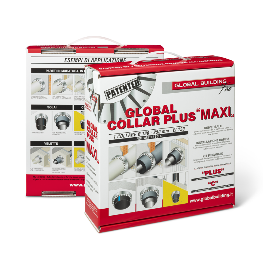 GLOBAL BUILDING GLOBAL COLLAR PLUS MAXI Collare per tubazioni di grandi dimensioni, senza alette di fissaggio con resistenza al fuoco fino a EI 120 C/U certificata su pareti in muratura o cartongesso, costituito da un guscio metallico in lamierino di acciaio sezione nominale 40x30x0,5 mm contenente guarnizione intumescente a base di grafite sezione nominale 40x2 mm, in conformità al Rapporto di classificazione I.G. 380080/4093.