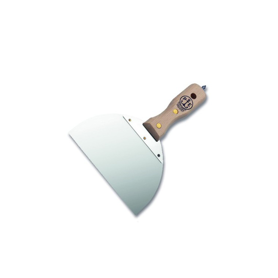 Spatola in acciaio inox per cartongesso. Dimensione 150 mm. Lama rinforzata, rettificata, flessibile, con inserto cacciavite e manico in legno.