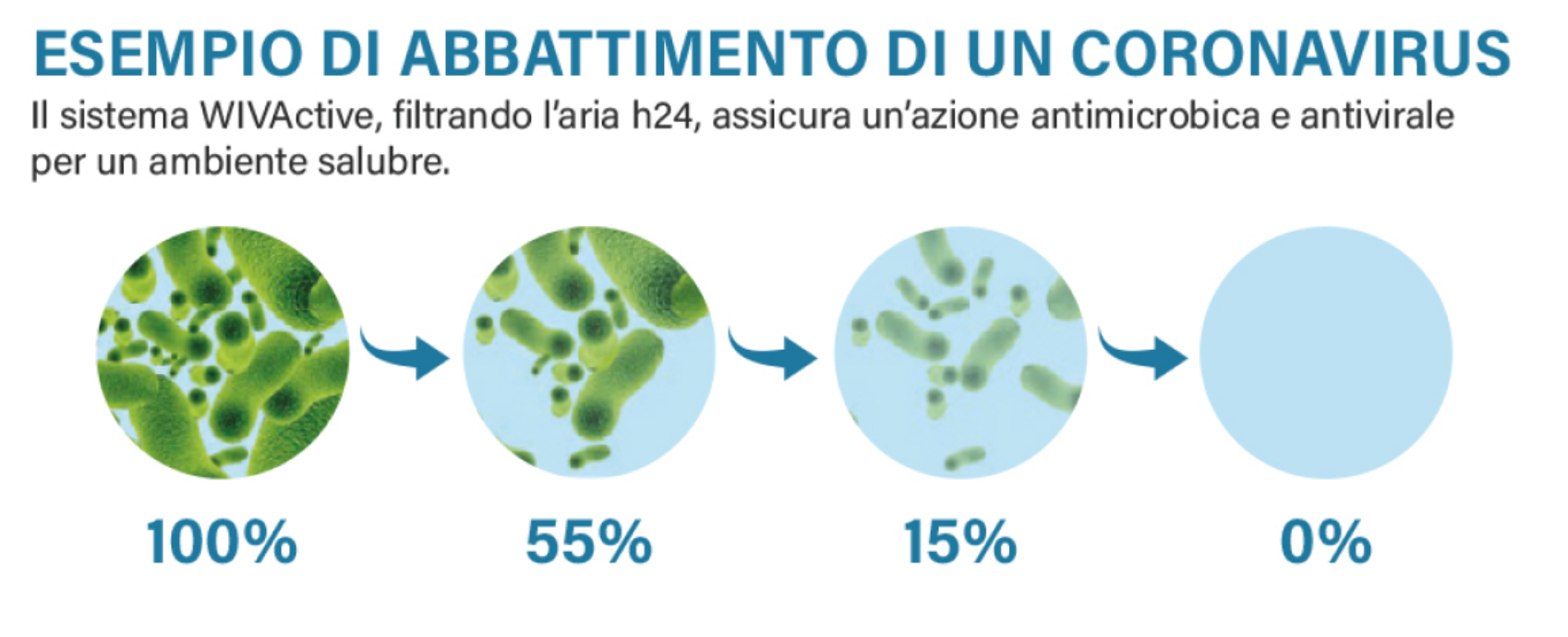 La combinazione tra luce Led e biossido di titanio, fa sì che gli ambienti vengano depurati da batteri, virus ed altre sostanze inquinanti.