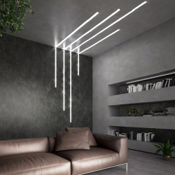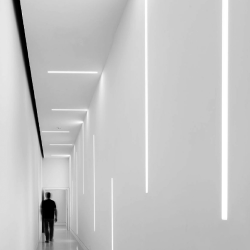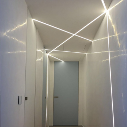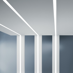 Lastre di cartongesso con profilo centrale in alluminio, utilizzati per creare tagli di luce, giochi e disegni su pareti, contropareti e controsoffitti.