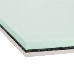 Isolante termo acustico fonoisolante ad elevate prestazioni. Pannello accoppiato composto da fibra poliestere, granuli di gomma SBR e cartongesso.