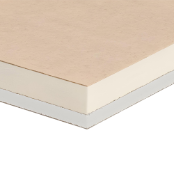 Pannello semisandwich prefabbricato, composto da una lastra di cartongesso di spessore 13 (o 10) mm accoppiata a pannelli POLIISO® PLUS rivestiti in carta metallizzata.
