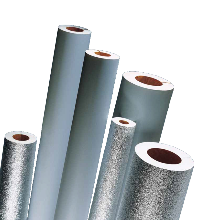Tubo isolante in poliuretano espanso con superficie esterna rivestita con foglio in PVC o alluminio a chiusura autoadesiva.