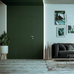 Porta a battente filo parete reversibile sui 4 lati che non richiede cornici coprifilo, per pareti in muratura o cartongesso.