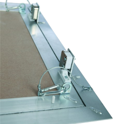 A partire dalla misura 300x300 mm la botola viene fornita con uno o più cavetti di sicurezza con moschettone da riagganciare dopo ogni apertura dello sportello in modo da evitare incidenti.