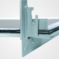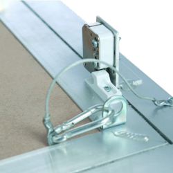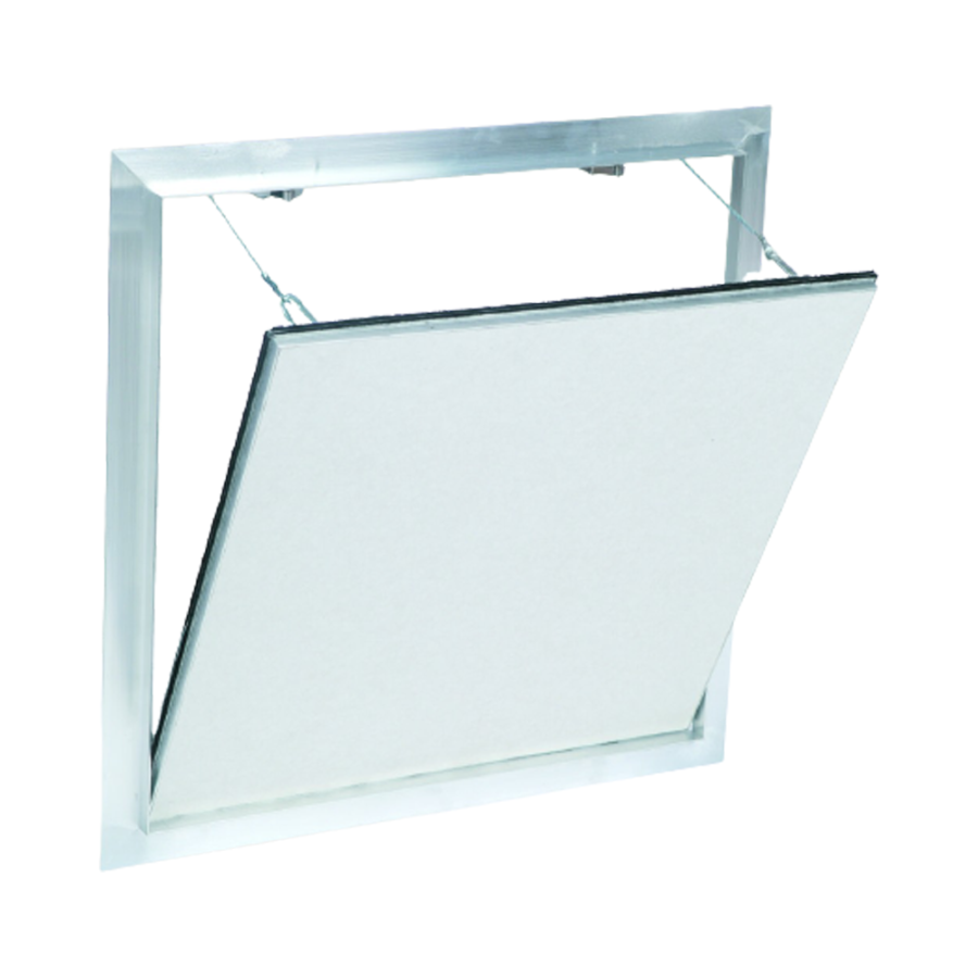Botola d'ispezione in alluminio "a tenuta d'aria e di polvere" composta da profili in alluminio con lastra di gesso rivestito impregnato idrorepellente da 12,5 mm, 15 mm o 25 mm e da due o più chiusure a scatto.