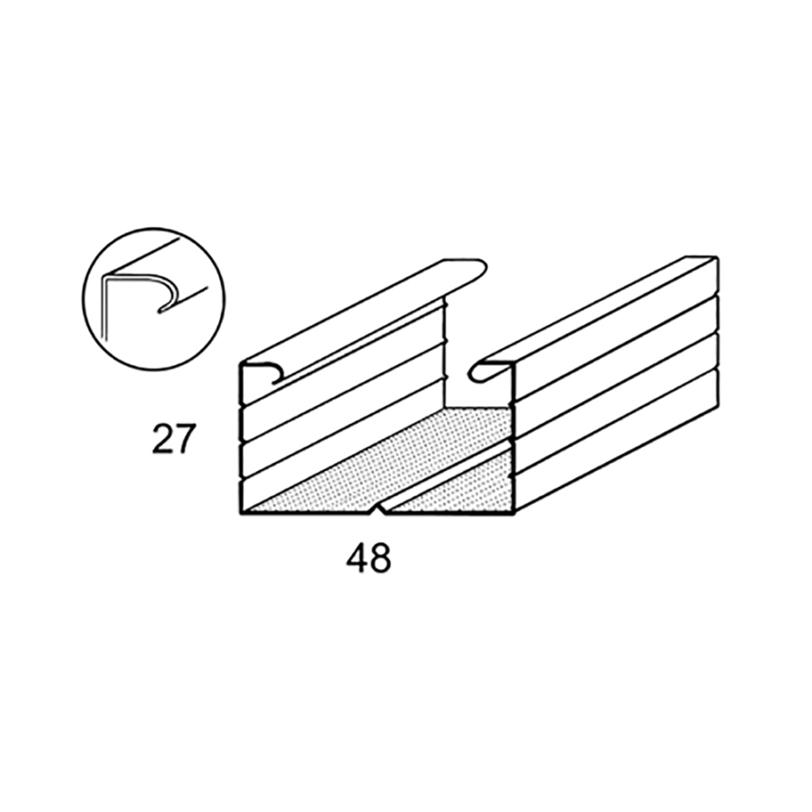 Profilo a C 50x27 bordo arrotondato, per soffitti e contropareti. Spessore 0.60 mm, spalla 27 mm, base 48 mm, alette 7.5 mm.