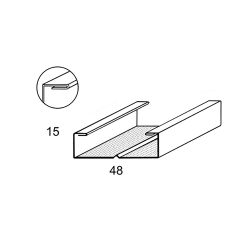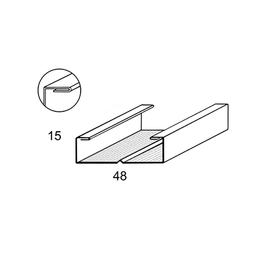 Profilo a C 50x15 bordo arrotondato, per soffitti e contropareti. Spessore 0.60 mm, spalla 15 mm, base 48 mm, alette 7.5 mm