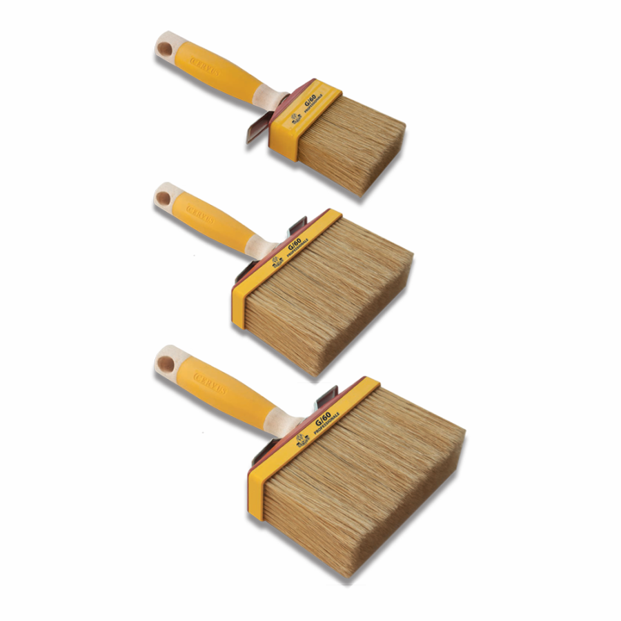 Resina epossidica, assicella in plastica, manico ergonomico legno/gomma antiscivolo, setola bionda qualità selezionata e fibra poliestere (disposizione a ciuffetti tondi, anti-goccia).