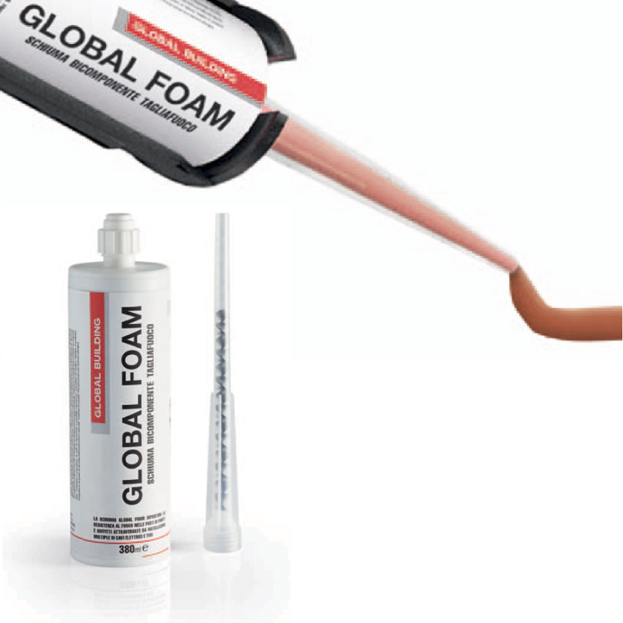 GLOBAL BUILDING GLOBAL FOAM Schiuma bicomponente tagliafuoco, è una schiuma ad elevato potere di espansione per la compartimentazione di attraversamenti di cavi elettrici, cavi per telecomunicazioni, fibre ottiche, tubi combustibili e incombustibili su pareti in calcestruzzo, cemento poroso o muratura; pareti leggere (in cartongesso) e solai.